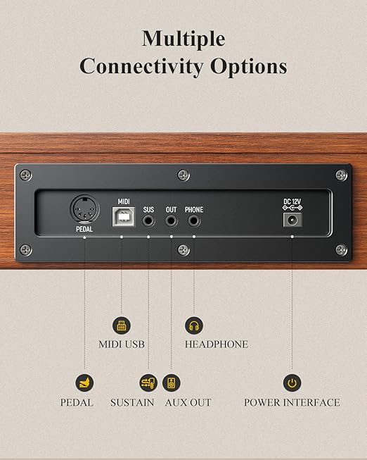 Keyboard piano 88 tuts ini menyediakan berbagai pilihan koneksi serba-guna, termasuk MIDI USB, pedal sustain, adaptor daya, output aux, dan jack headphone untuk memenuhi berbagai kebutuhan anda. Headphone yang disertakan memungkinkan untuk latihan tanpa suara, sehingga anda dapat bermain di rumah dan larut dalam bermain musik.