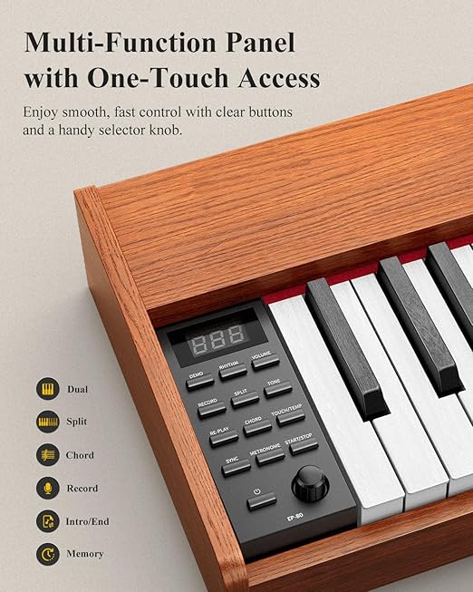 Desain serat kayu yang unik pada piano ini cocok dengan gaya rumah anda, dan dudukan piano yang dapat dilepas juga memastikan portabilitas dan fleksibilitas piano. Piano elektrik yang ringan dan portabel ini berukuran 51.18″ x 9.65″ x 3.23″, desainnya yang ringkas membantu anda untuk lebih menikmati dalam bermain musik.
